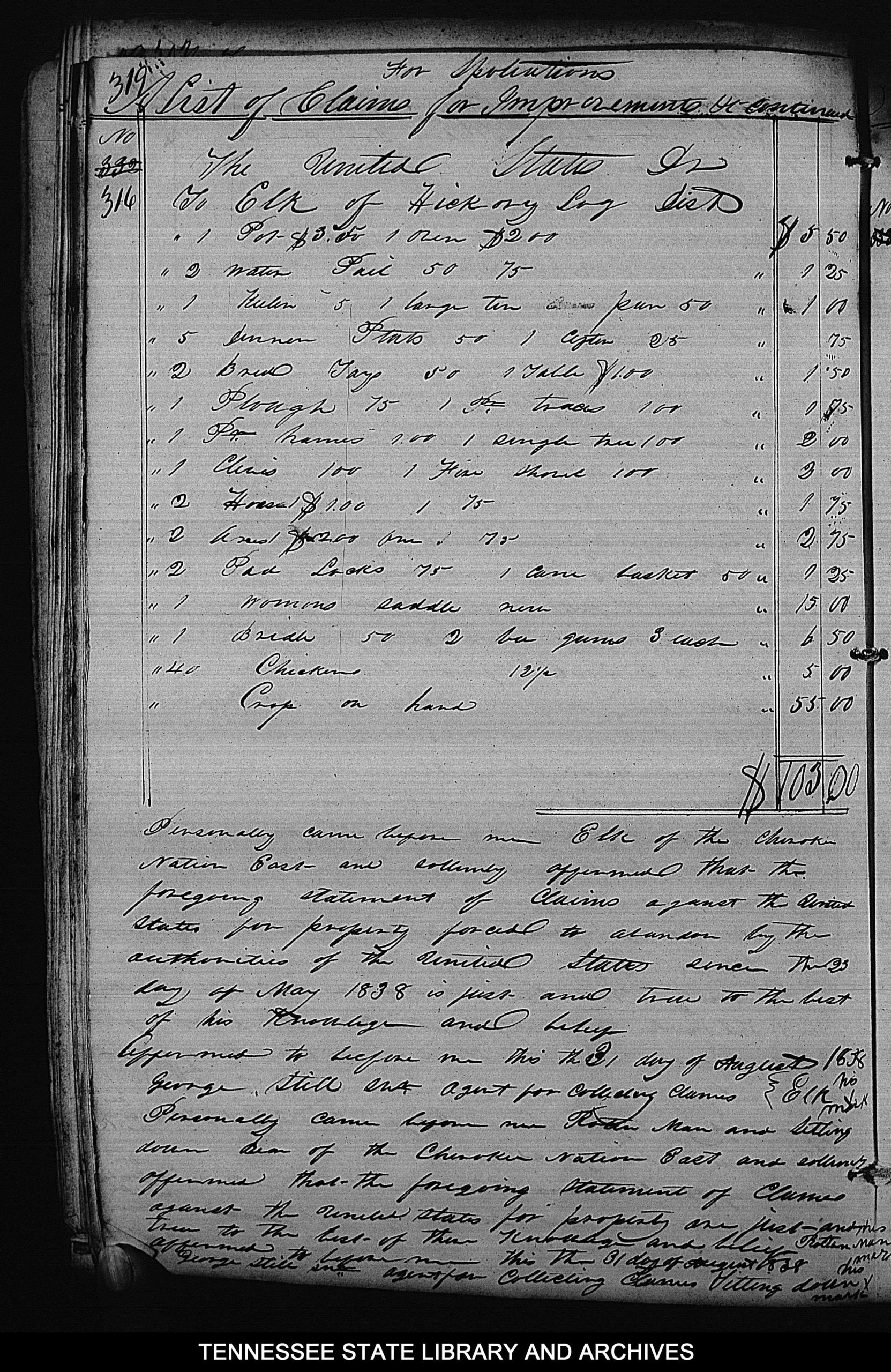 Personally came before me Elk of the Cherokee Nation East and solemnly affirmed that the foregoing statement of claims against the United States for property forced to abandon by the authorities of the United States since the 23 day of May 1838 is just and true to the best of his knowledge and belief